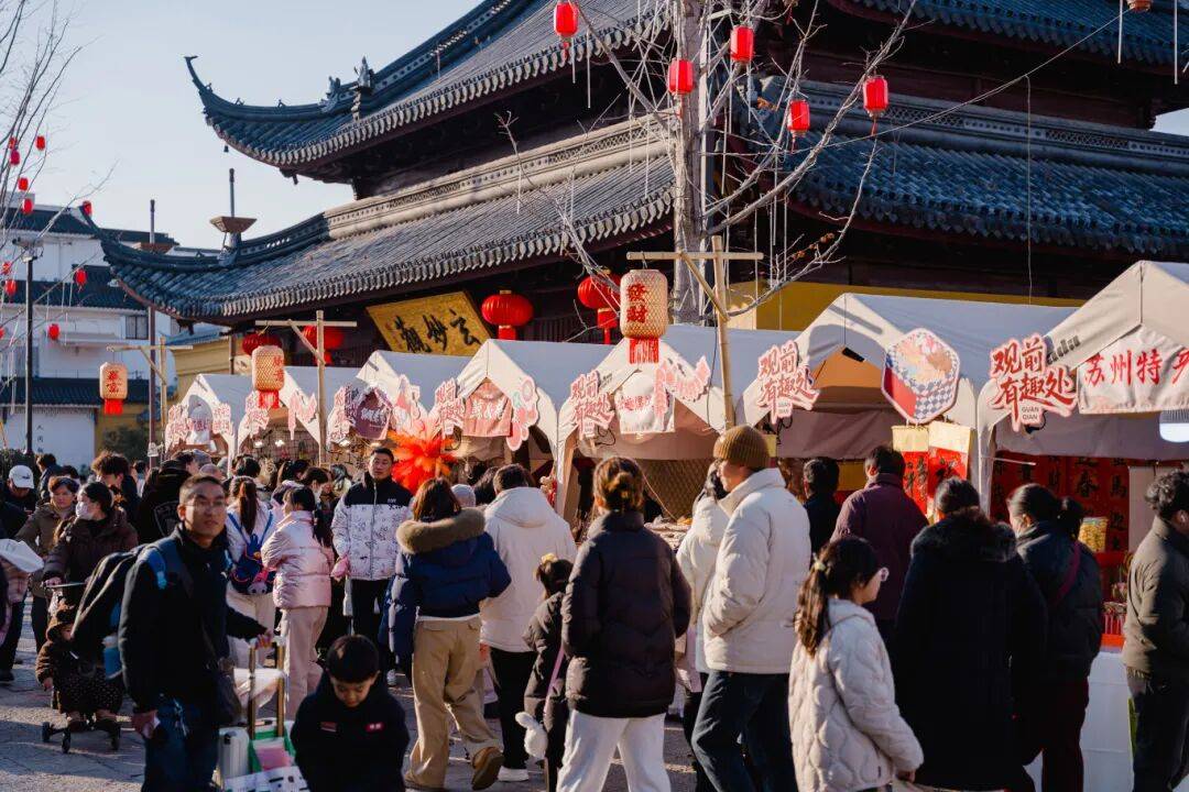“观前有趣处,民俗贺新岁”2026 观前街新年市集汇聚了多家商户,涵盖非遗文创、苏式美食、各地小吃、民俗体验等,让市民游客在逛吃玩赏中感受最鲜活的姑苏烟火气。